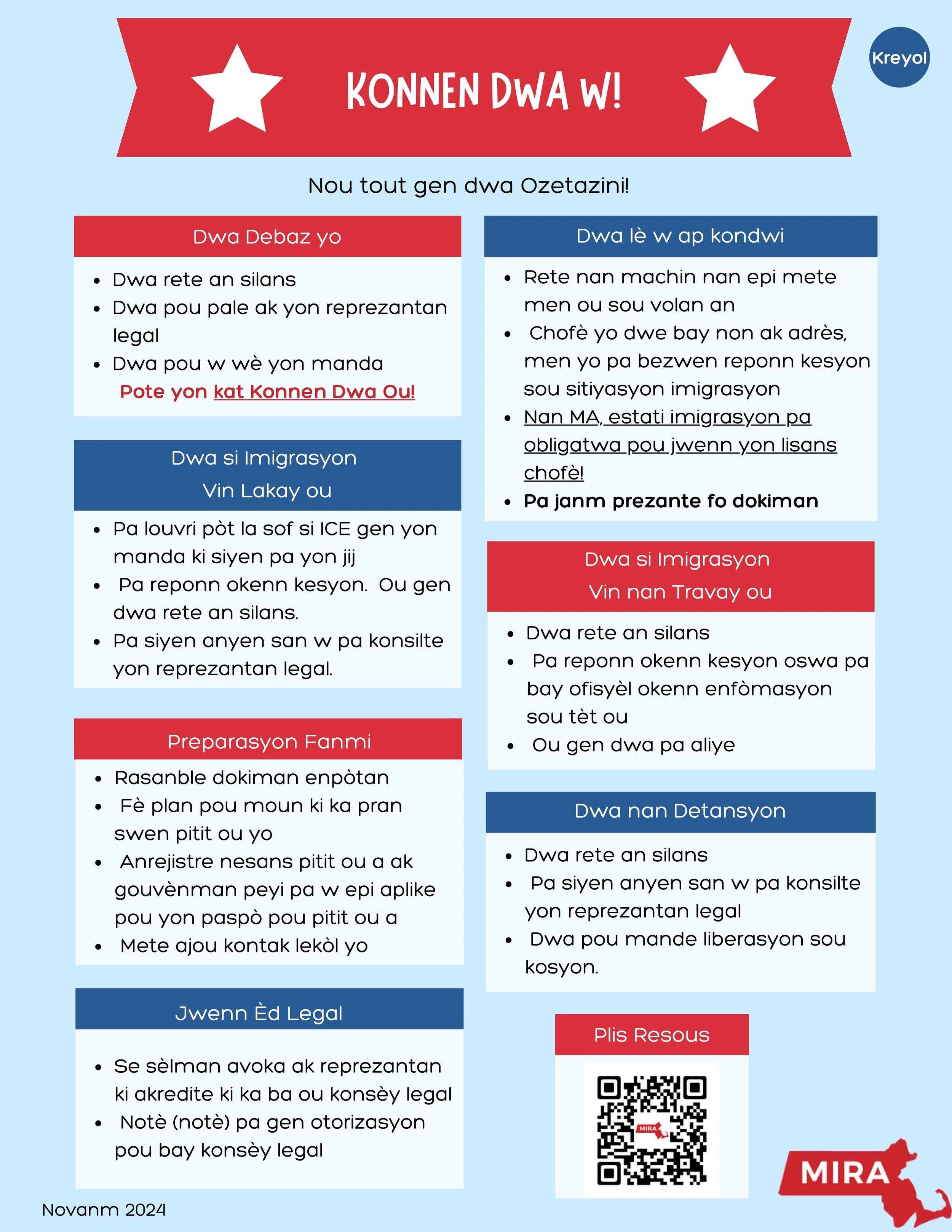 Konnen dwa wConozca sus derechosKnow Your Rights Más información. plis enfòmasyon KNOW YOUR RIGHTS - cards to print ENGLISH KNOW YOUR RIGHTS - kat pou enprime KREYOL KNOW YOUR RIGHTS - Tarjetas para imprimir ESPANOL Subscribe Sign up with your email address to receive news and updates. Email Address Sign Up Thank you!